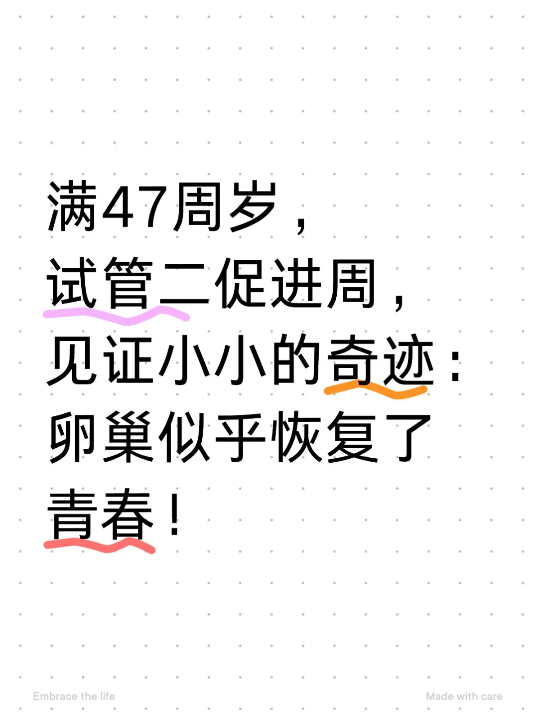 没有做试管婴儿前根本不知道怀孕竟然如同打怪,要有好的卵子,好的精子,好的输卵管,好的子宫,好的身体免疫系统,最最重要的是要有好的孕气!就算你都有了,你也要确定精卵能否结合,双方染色体是否正常。真的觉得太难了,自怀是15%的成功率,试管婴儿是25%-45%的成功率。现在才知道试管并不是怀孕的保险,而是...[查看阅读]